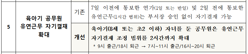 즉, 육아기 자녀를 둔 공무원은 유연근무 자기결재 조정범위가 2시간까지지 확대되어, 부모들이 상황에 맞게 근무 일정을 조정할 수 있는 자율성이 크게 향상됩니다.