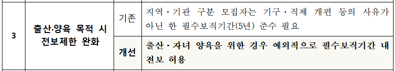 그러나 이번 개정으로 인해 출산과 양육을 위한 특별한 경우에는 필수 보직기간 내에서도 전보가 가능해집니다.
