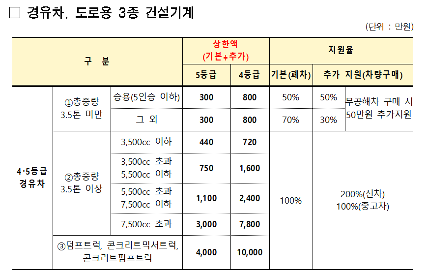 5등급 경유차 및 건설기계 또한 상한액 내에서 보조금이 지급됩니다.