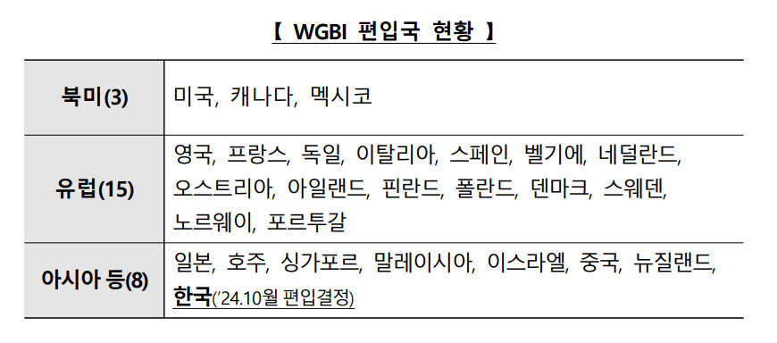 이 지수는 전 세계적으로 약 2조5000억 달러의 자금을 추종하고 있어 각국의 국채가 WGBI에 편입되면 상당한 자금 유입을 기대할 수 있습니다.
