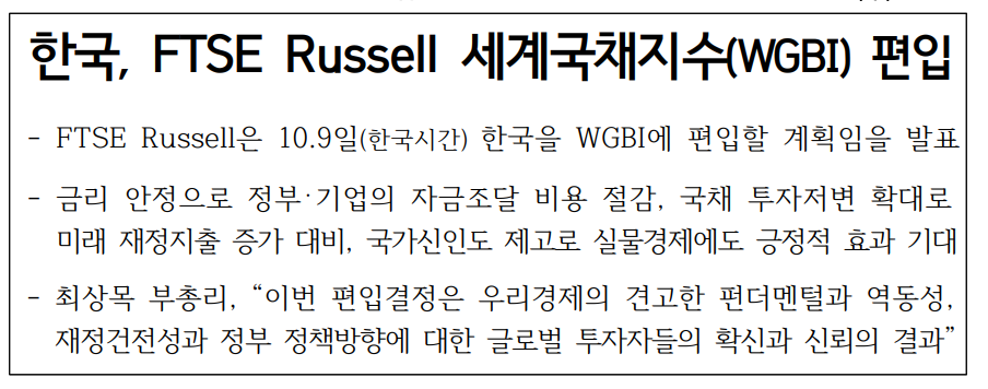 한국이 세계 3대 채권지수 중 하나인 세계국채지수(WGBI, World Government Bond Index) 편입에 드디어 성공했습니다.