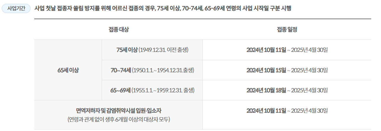 질병관리청에 따르면, 이번 접종은 내년 4월 30일까지 진행되며, 고위험군인 65세 이상 어르신, 생후 6개월 이상 면역저하자 및 감염취약시설 입원·입소자의 중증화 및 사망 예방을 목표로 하고 있습니다.