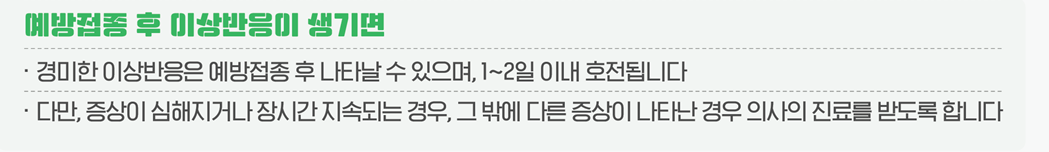 ▶접종 부위 관리: 접종 부위는 청결하게 유지하며, 심한 압박이나 마사지를 피해야 합니다.