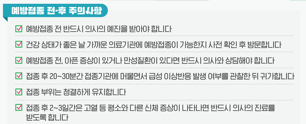 ▶접종 부위 관리: 접종 부위는 청결하게 유지하며, 심한 압박이나 마사지를 피해야 합니다.