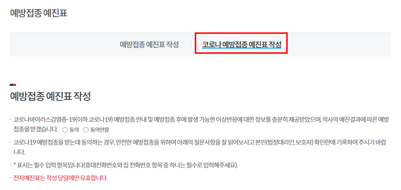 단, 예진표는 접종 당일에 작성해야 유효하며, 인플루엔자와 동시에 접종할 경우 각각의 예진표를 따로 작성해야 합니다.