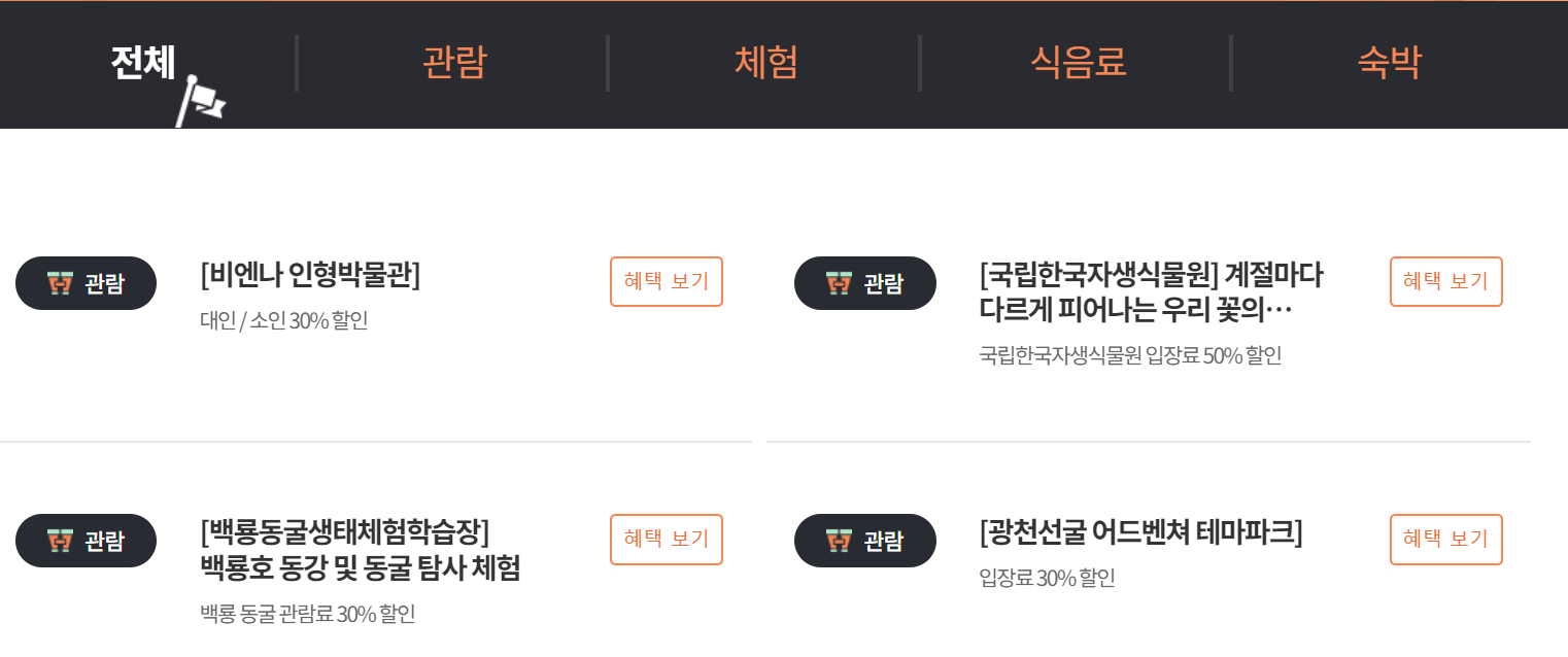 ▶관람: 박물관, 미술관 등 관광지를 할인된 가격으로 입장할 수 있습니다.