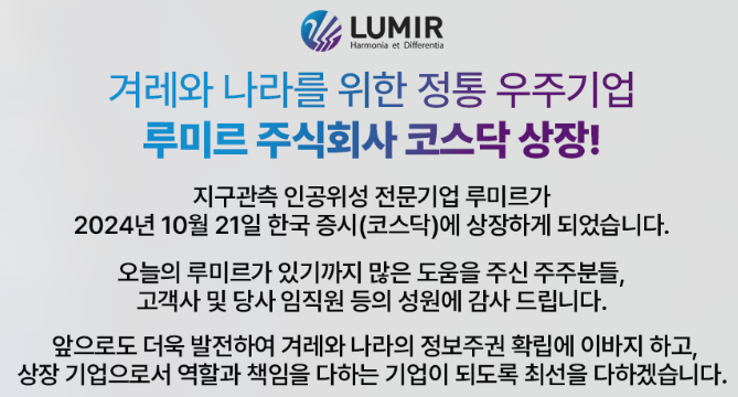 남명용 루미르 대표는 "이번 상장을 통해 SAR 영상정보 서비스 제공을 위한 자체 개발 SAR 위성군집 시스템 계획을 달성하고, 더 높은 성장을 위해 지속적으로 투자할 것"이라고 밝혔습니 다.