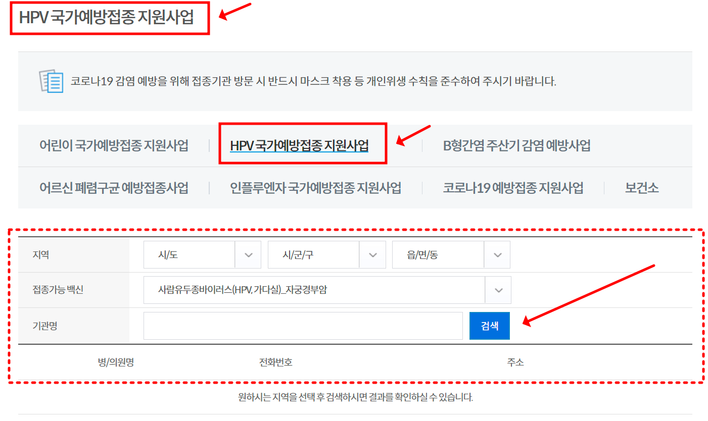 질병관리청 예방접종도우미 누리집에 접속하시면 내 주변에서 제일 가까운 HPV국가예방접종 지정의료기관을 검색할 수 있습니다.