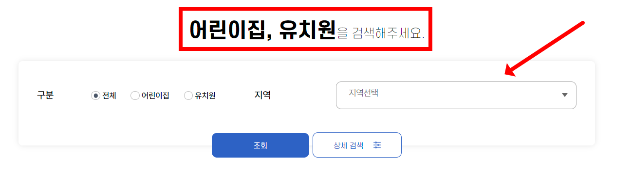 교육기관 검색 메뉴를 통해 원하는 지역, 유형(국공립, 사립 등), 특징(영어 특화, 소규모 등) 등을 선택하여 검색합니다.