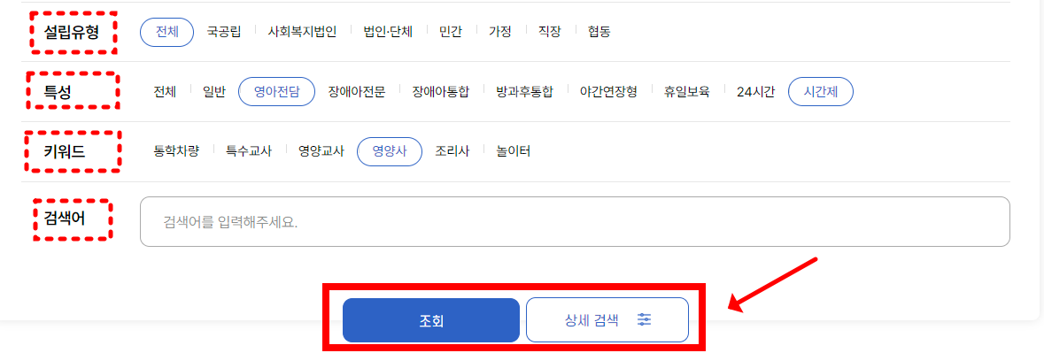 교육기관 검색 메뉴를 통해 원하는 지역, 유형(국공립, 사립 등), 특징(영어 특화, 소규모 등) 등을 선택하여 검색합니다.