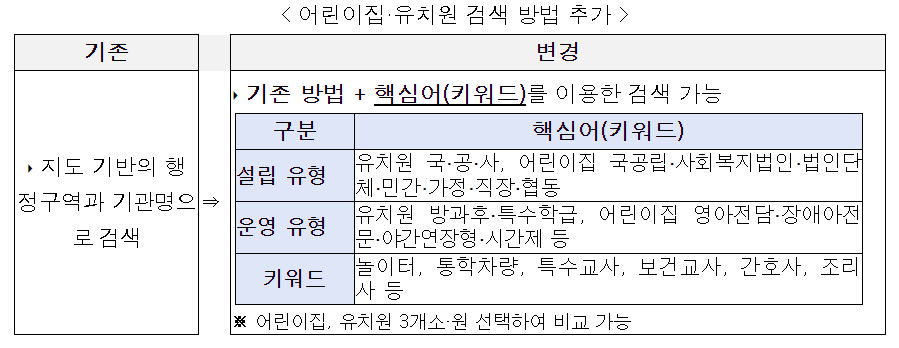 ▶통합 검색: 핵심어(키워드)를 이용하여 어린이집과 유치원을 비교 검색할 수 있습니다.