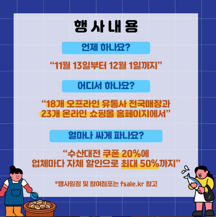 대한민국 수산대전, 제철 수산물 할인행사 안내, 온누리상품권 및 제로페이 행사매장, 수산물 카드뉴스 제공