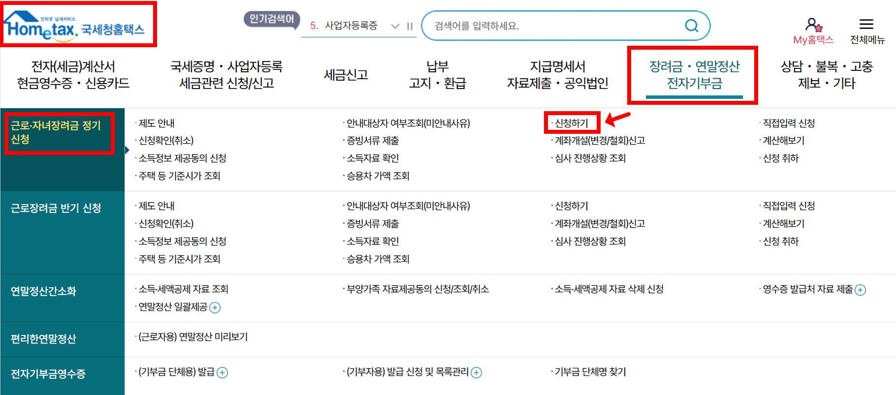 홈택스에 로그인 → 장려금 연말정산 전자기부금 → 근로 자녀장려금 정기신청→ 직접입력 신청