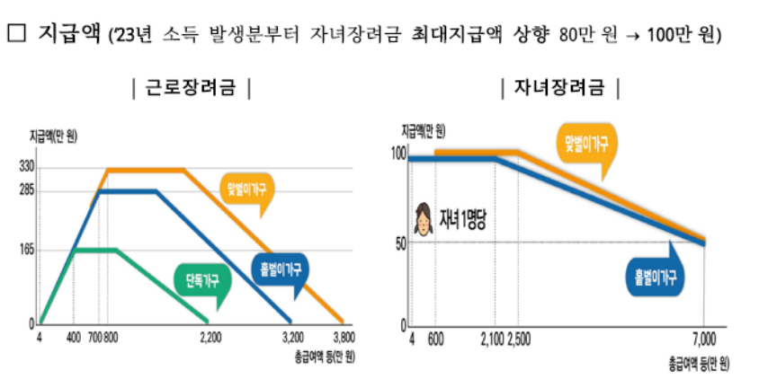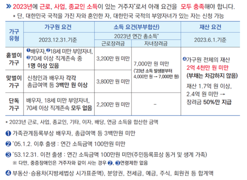 근로·자녀장려금은 저소득 가구를 대상으로 소득과 재산 요건을 충족하는 경우 지급되는 정부 지원금입니다.