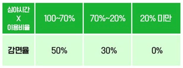 심야 시간대 이용 비율에 따라 감면율이 달라지며, 최대 50%까지 할인받을 수 있습니다.