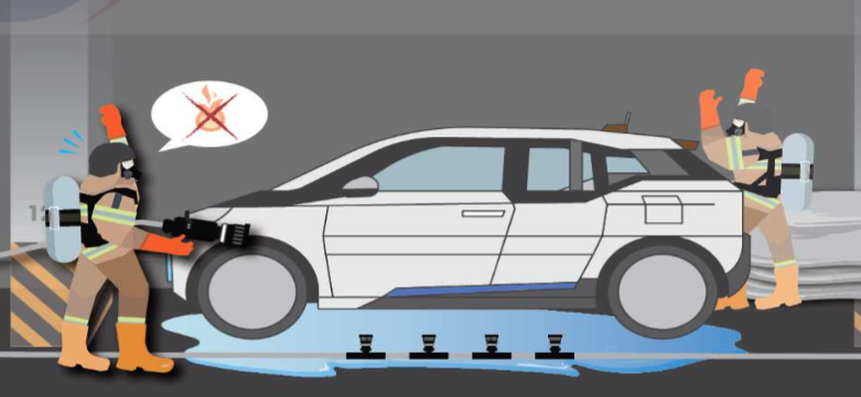 ▶배터리 위치: 전기차 배터리는 차량 하부에 위치하여 소화약제가 직접 닿기 어려운 구조입니다.