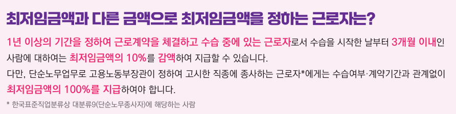 ▶수습근로자: 수습 기간 동안에는 최저임금의 90%까지 임금을 지급할 수 있습니다.